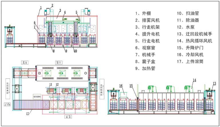 Composition of upper drum section, cleaning section, circuitous rotary section, drying furnace section, air cooling section, hanging basket and electrical control system。